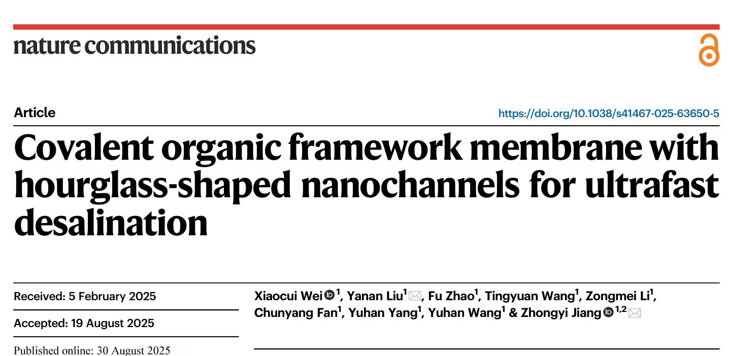 化学化工学院姜忠义教授、刘亚楠教授最新Nature子刊:具有沙漏形纳米通道的共价有机框架膜实现超快脱盐